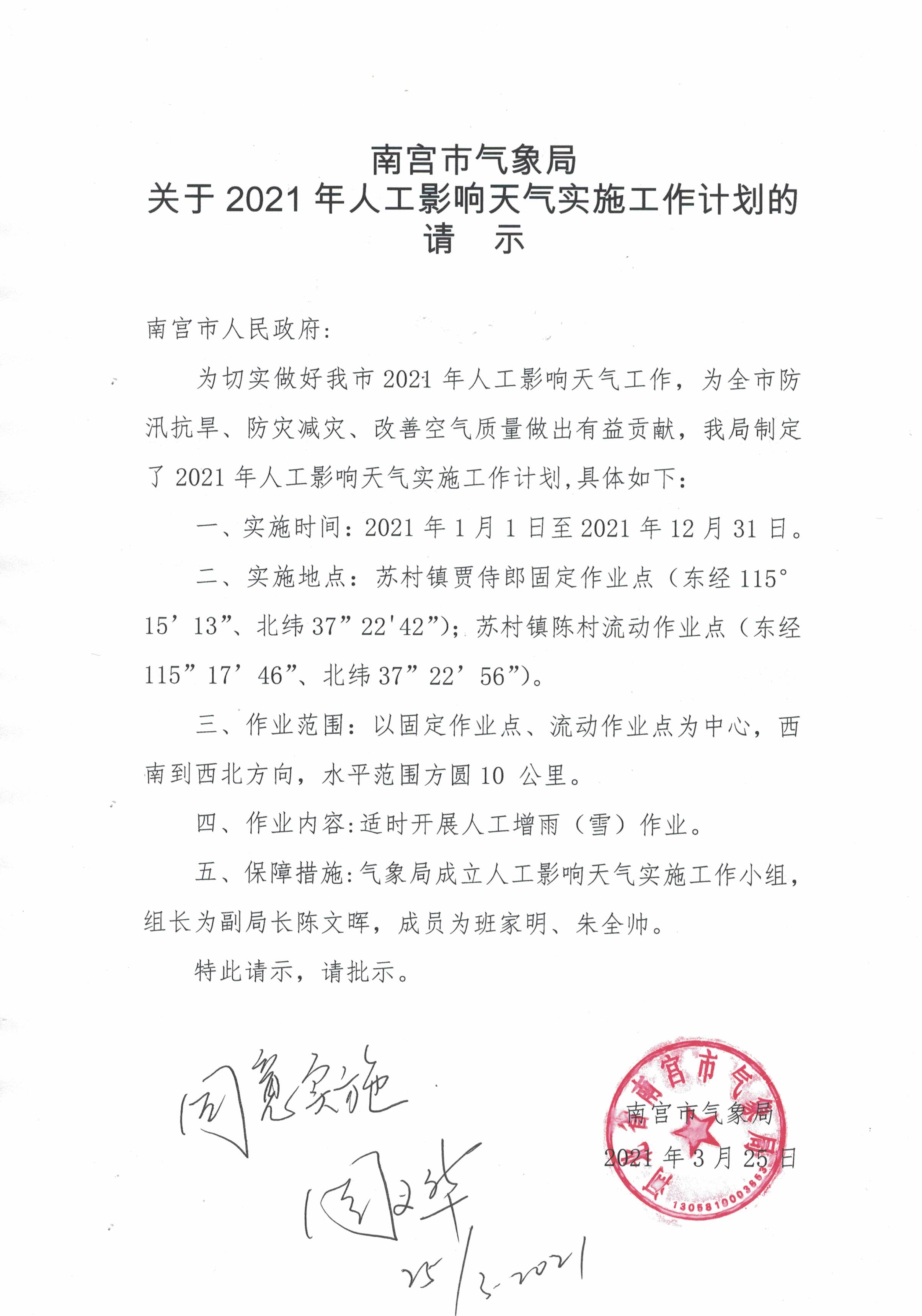 为切实做好我市2021年人工影响天气工作,为全市防汛抗旱、防灾减灾、改善空气质量做出有益贡献,我局制定了2021年人工影响天气实施工作计划,现已经市政府主管领导批准实施,现公告如下: